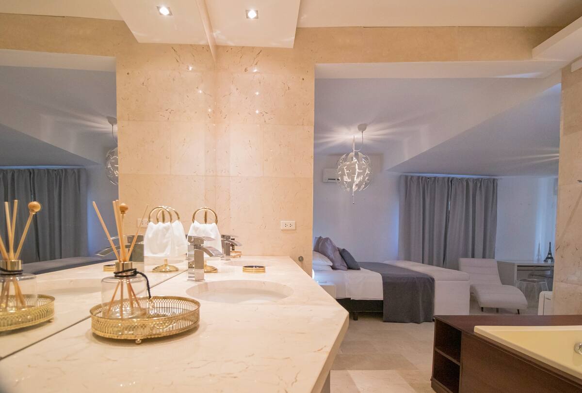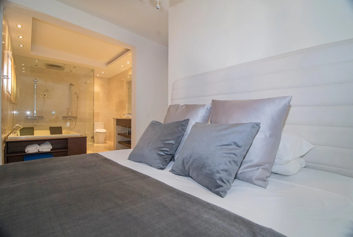 The villa unfolds across two luxurious levels. The ground floor boasts two spacious bedrooms, each featuring a private bar and en-suite bathroom, alongside a grand dining area and a fully-equipped kitchen. Ascend the elegant staircase to discover the opulent master suite, complete with dual showers, sinks, a double jacuzzi, a dedicated dressing room, a private balcony, and unparalleled luxury. Two additional bedrooms share a second bathroom, with one offering a private balcony overlooking the manicured front garden.